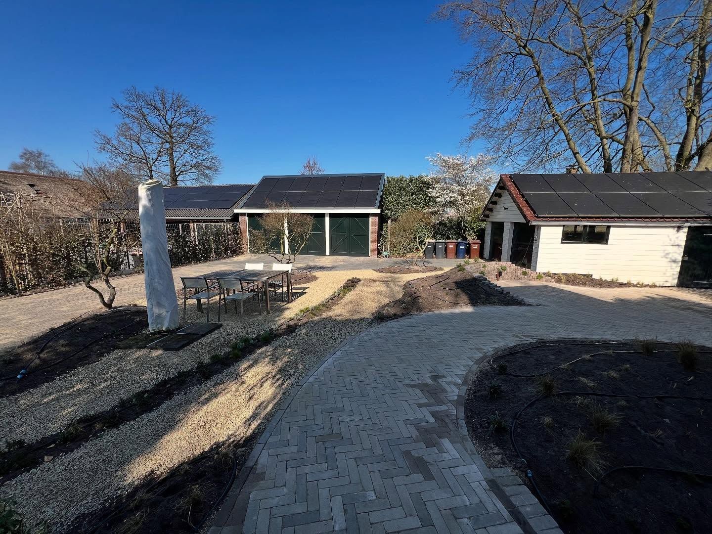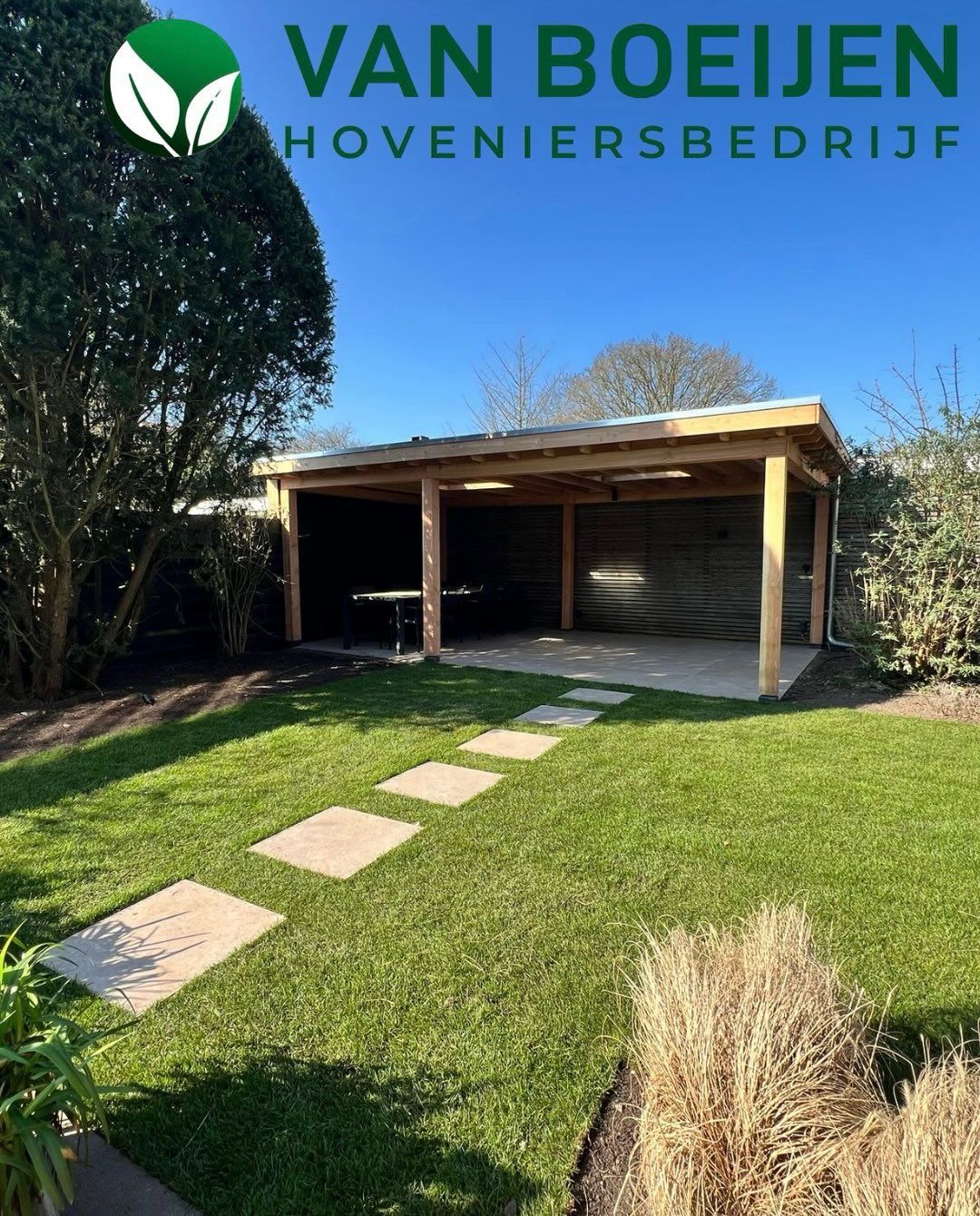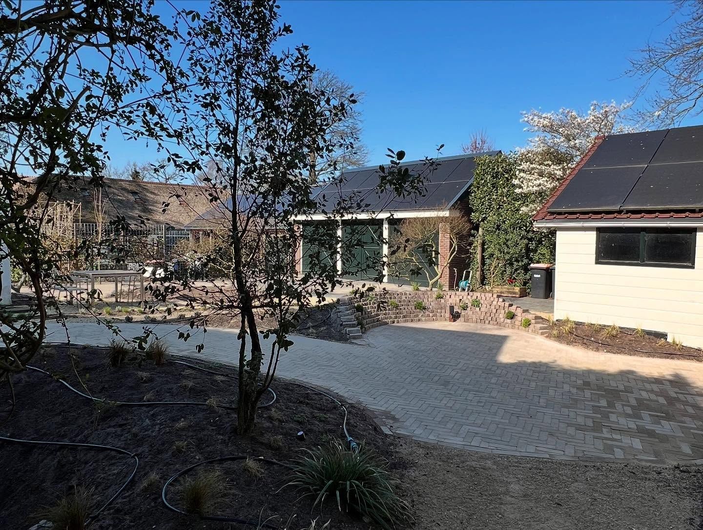 Locatie: Soest Project: Luxe tuinaanleg met schuur, bestrating & beplanting Vandaag delen we trots een prachtig project in Soest! We hebben een moderne, stijlvolle schuur gebouwd, afgewerkt met ramen voor natuurlijk licht en een groen dak dat perfect past bij de natuurlijke omgeving. Dankzij de samenwerking met Broek & Bosch Elektrotechniek hebben we de schuur voorzien van sfeervolle verlichting die de tuin ’s avonds een warm karakter geeft. Naast de schuur ligt een pad van klinkers, aangelegd in een klassiek visgraatpatroon, dat zorgt voor een strak en duurzaam resultaat. Een rand van grind langs de schuur zorgt voor een mooi, afgewerkt geheel. Om het plaatje af te maken: een prachtige pergola met Toscaanse jasmijn voor een mediterrane sfeer, photinia leibomen zodat de buren tegen een groene wand aankijken en een Zweeds rabat schutting van duurzaam Douglas hout. Projectdetails: • Schuur met groene dakbedekking en grote ramen • Verlichting aangelegd door: Broek & Bosch Elektrotechniek • Klinkers in visgraatpatroon • Grindrand langs de schuur • Pergola met Toscaanse jasmijn • Zweedse rabat schutting van Douglas hout • Leibomen geplaatst zodat de buren tegen een groene wand aankijken Volg ons voor meer inspirerende tuinprojecten en ideeën voor jouw buitenruimte!