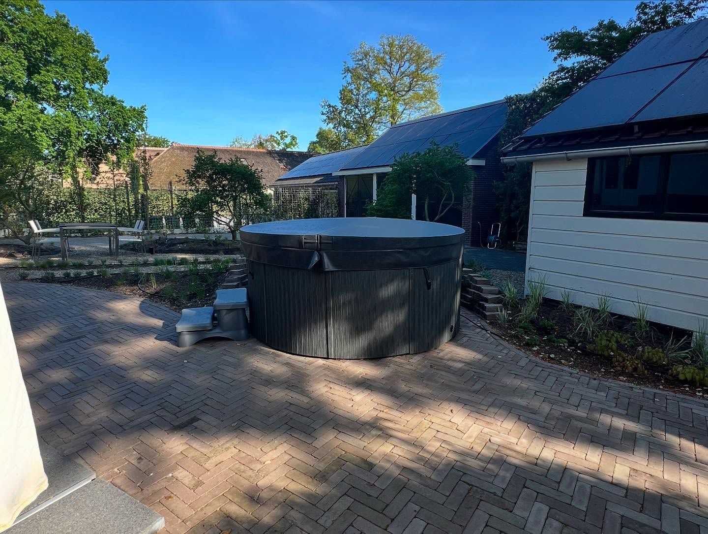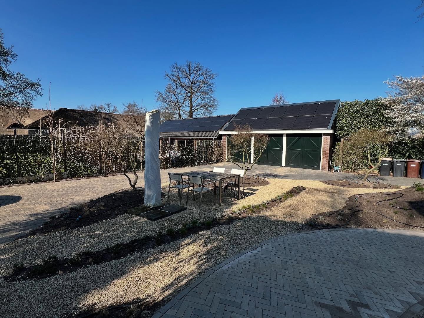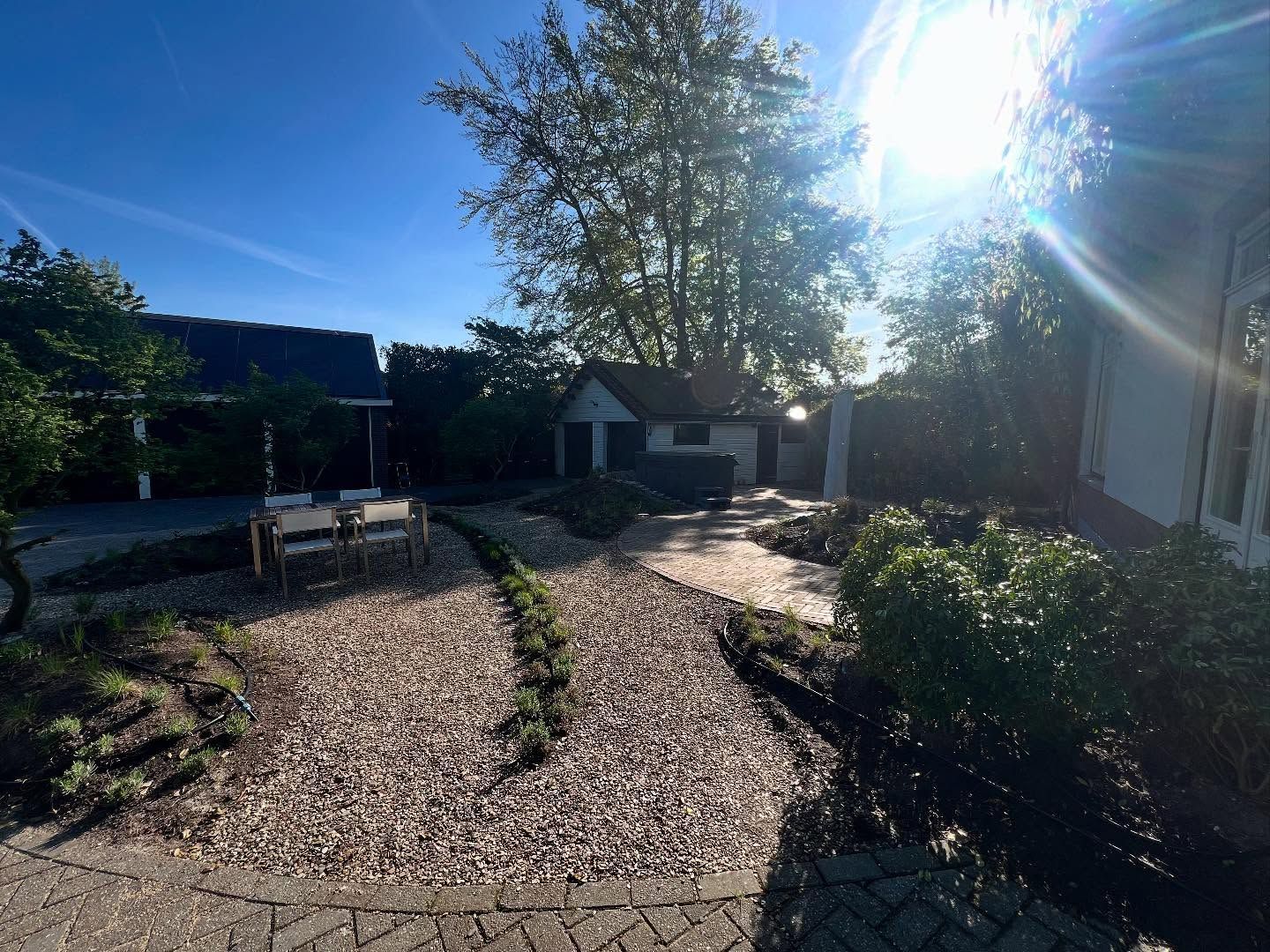 Locatie: Soest Project: Luxe tuinaanleg met schuur, bestrating & beplanting Vandaag delen we trots een prachtig project in Soest! We hebben een moderne, stijlvolle schuur gebouwd, afgewerkt met ramen voor natuurlijk licht en een groen dak dat perfect past bij de natuurlijke omgeving. Dankzij de samenwerking met Broek & Bosch Elektrotechniek hebben we de schuur voorzien van sfeervolle verlichting die de tuin ’s avonds een warm karakter geeft. Naast de schuur ligt een pad van klinkers, aangelegd in een klassiek visgraatpatroon, dat zorgt voor een strak en duurzaam resultaat. Een rand van grind langs de schuur zorgt voor een mooi, afgewerkt geheel. Om het plaatje af te maken: een prachtige pergola met Toscaanse jasmijn voor een mediterrane sfeer, photinia leibomen zodat de buren tegen een groene wand aankijken en een Zweeds rabat schutting van duurzaam Douglas hout. Projectdetails: • Schuur met groene dakbedekking en grote ramen • Verlichting aangelegd door: Broek & Bosch Elektrotechniek • Klinkers in visgraatpatroon • Grindrand langs de schuur • Pergola met Toscaanse jasmijn • Zweedse rabat schutting van Douglas hout • Leibomen geplaatst zodat de buren tegen een groene wand aankijken Volg ons voor meer inspirerende tuinprojecten en ideeën voor jouw buitenruimte!